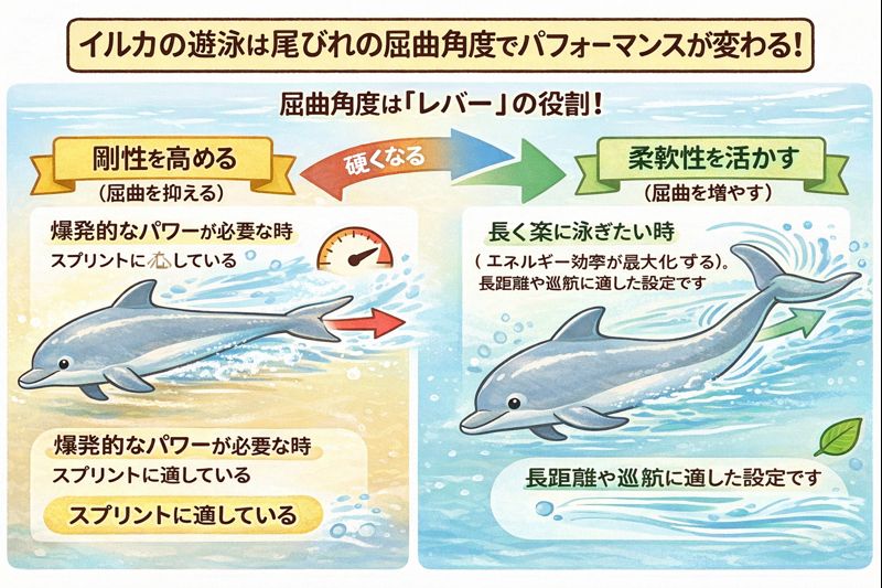 イルカは、通常巡航時はしなやかに、瞬発的な加速時は尾びれの付け根を「硬く」して、推進力を11.2%も向上させていることが分かりました。