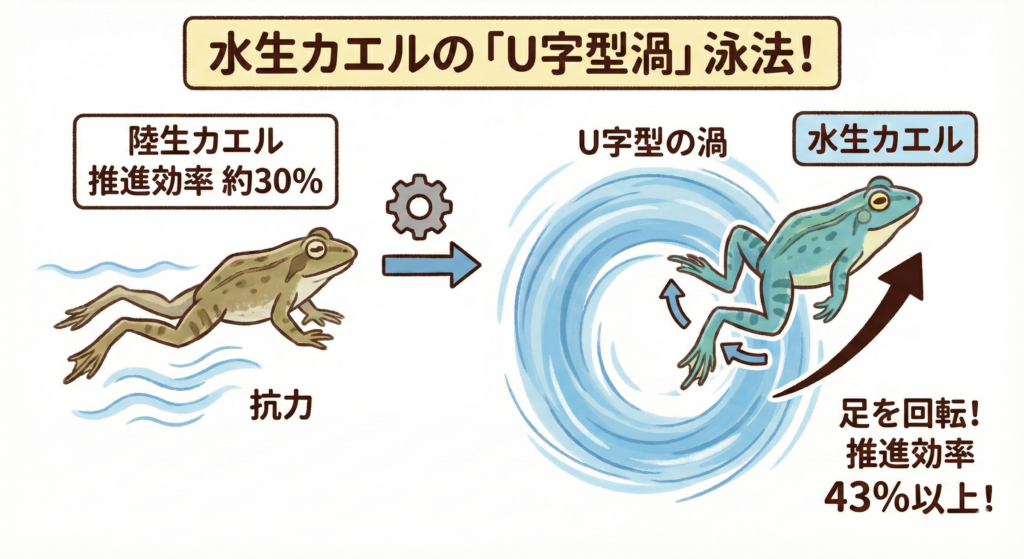 水生カエルの研究では、足を単に後ろに蹴るのではなく、外から内へ「円を描くように」絞り込むことで、飛行機の翼と同じ「揚力」を生み出していることが判明しています。