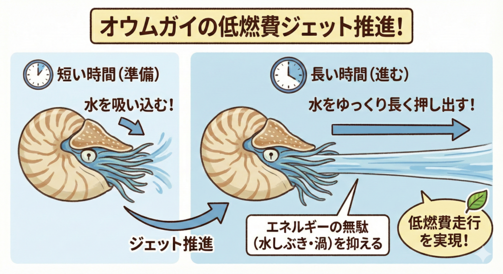 深海の省エネスイマー・オウムガイは、水を吸い込む時間を極端に短く、水を吐き出す(進む)時間を長く取ることで、エネルギーロスを最小限に抑えているようです。