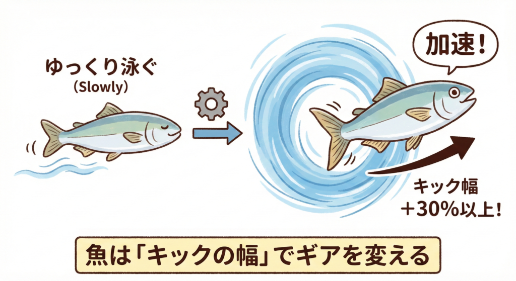 魚は、急加速が必要なとき、尾びれを振る「頻度」だけでなく、振る「幅(振幅)」を30%以上も一気に増加させる。